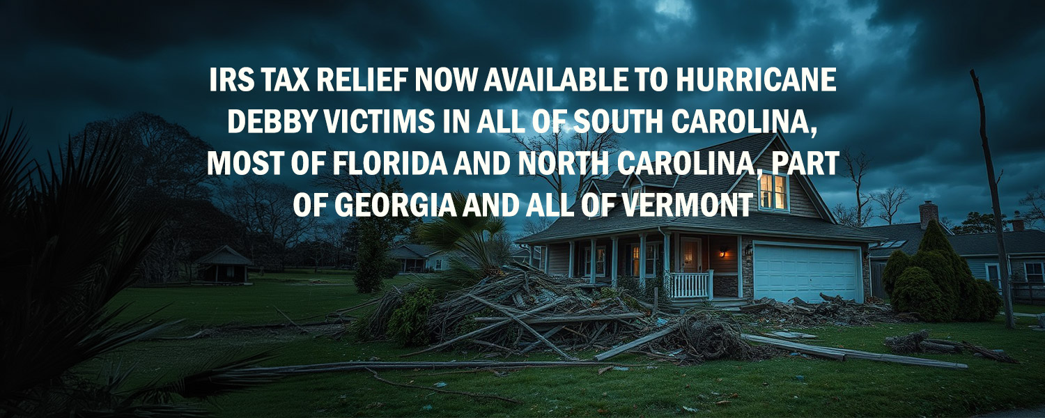 The IRS announced on August 9, 2024 tax relief for individuals and businesses in four states (South Carolina, Florida, North Carolina and Georgia) and on August 13, 2024 the IRS announced tax relief for individuals and businesses in the state of Vermont affected by Hurricane Debby now have until February 3, 2025, to file various federal individual and business tax returns and make tax payments.