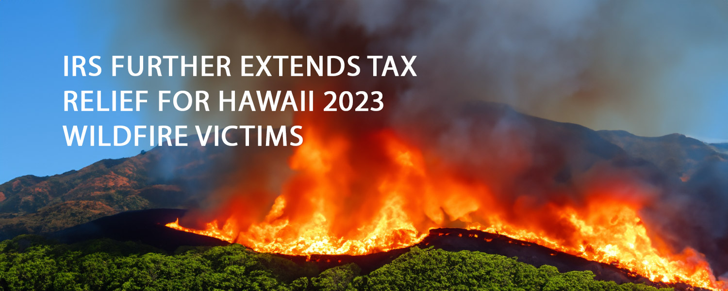 On March 27, 2024 the Internal Revenue Service (IRS) announced further postponement until August 7, 2024, various tax-filing and tax-payment deadlines for individuals and businesses affected by the August 8, 2023, wildfires in Hawaii. Previously, the deadline was February 15, 2024.