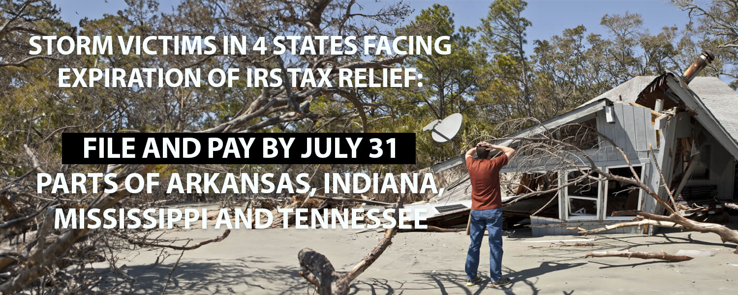 Storm victims in 4 states facing expiration of IRS tax relief: File and pay by July 31; parts of Arkansas, Indiana, Mississippi and Tennessee.