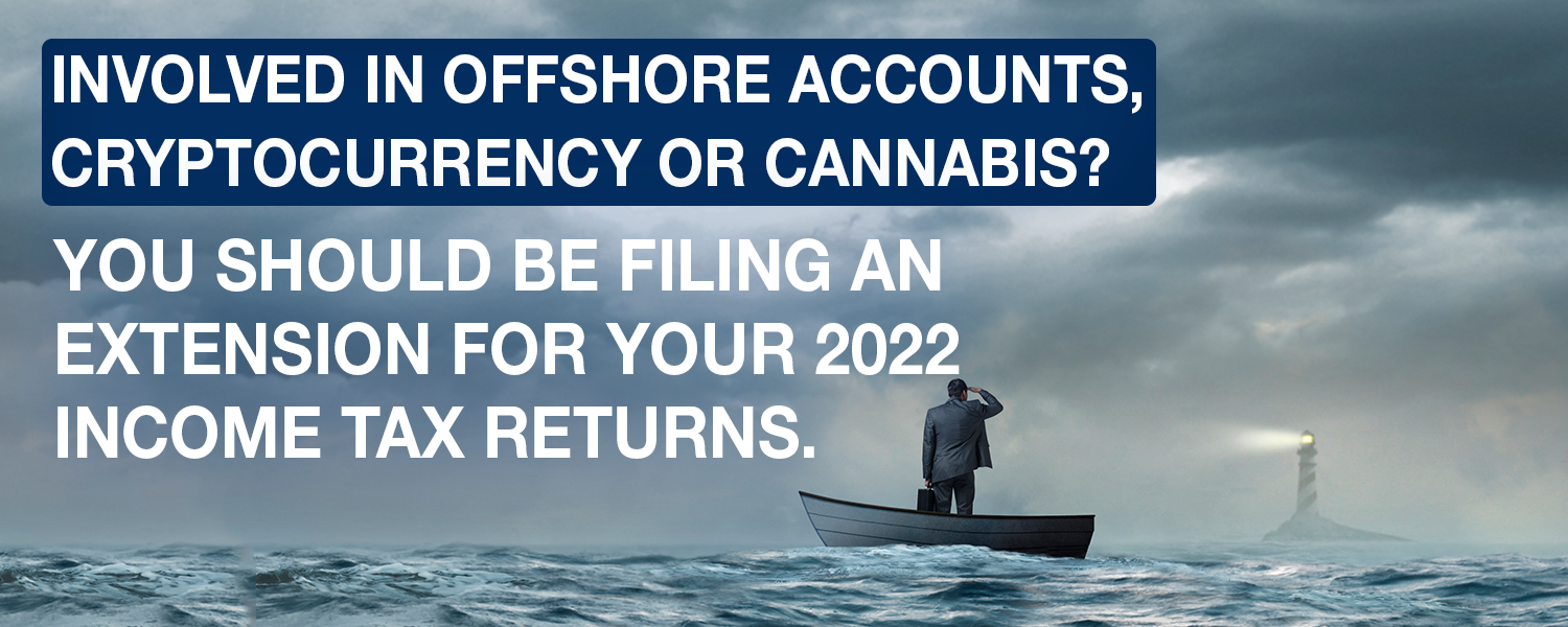 Why Taxpayers Involved In Offshore Accounts, Cryptocurrency Or Cannabis Should Be Filing An Extension For Their 2022 Income Tax Returns.